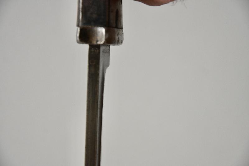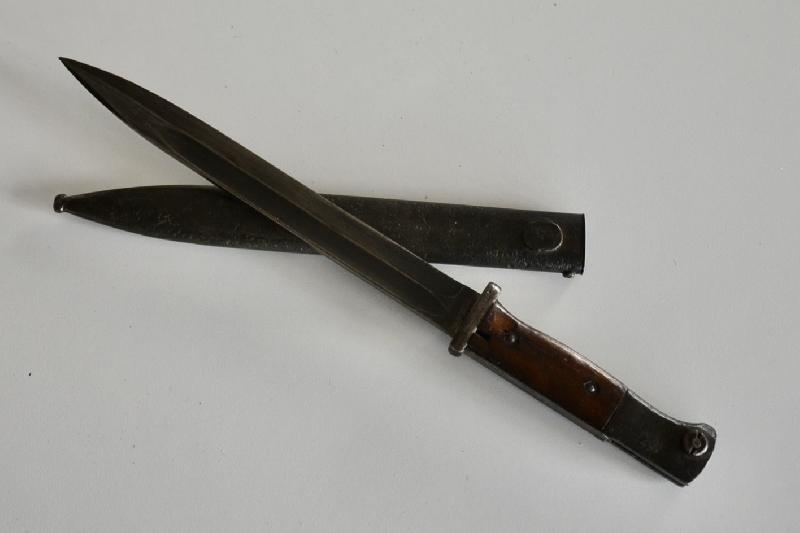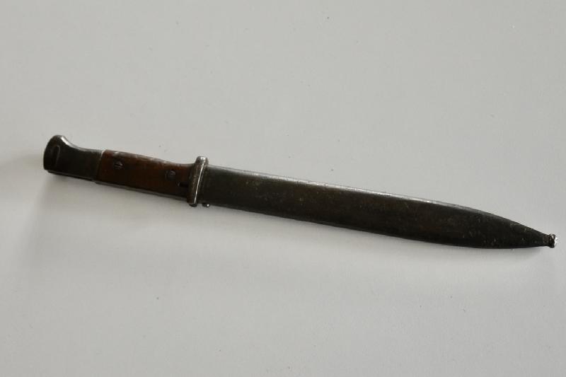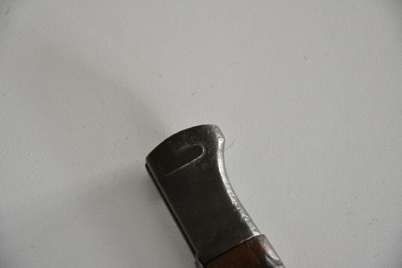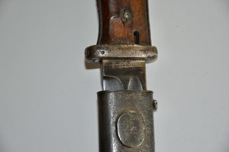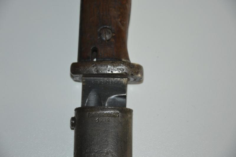 Baïonnette 98K plaquette bois au meme numéro et fabricant P.WEYERSBERGER datée 1938, manque le bouton du fourreau ?? lame superbe.