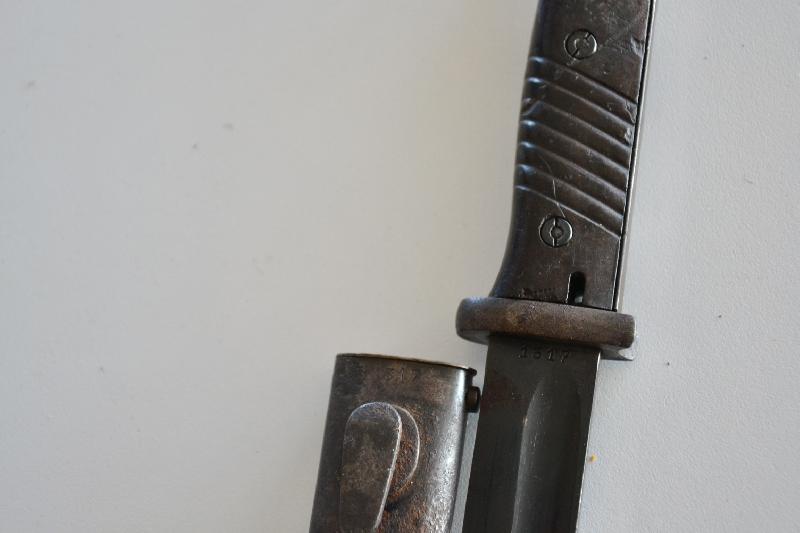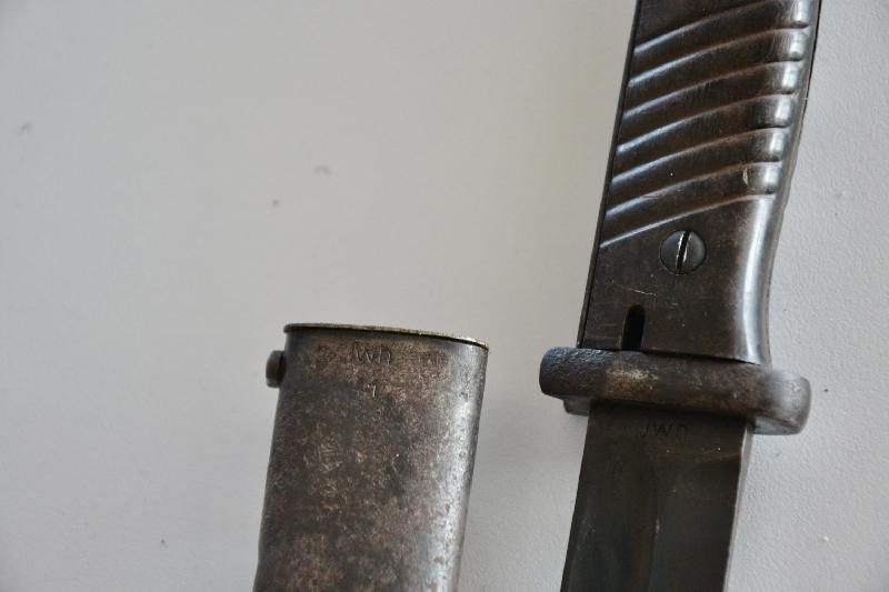 Rare baïonnette 98K de 1941 avec fabricant JWH ( Chatelleraut seul fabricant français pour les Allemand) au meme numéro et dans un état mint lame encore bleue et pas aiguisée, fourreau un peu moins beau.