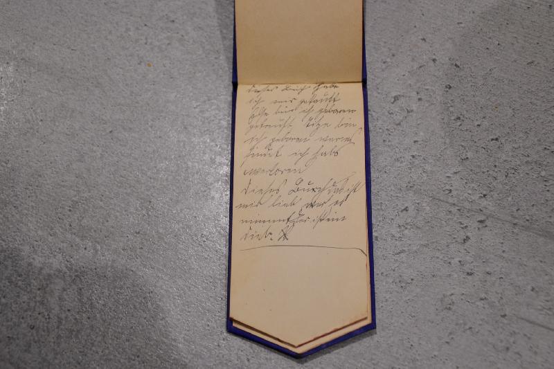 Très sympa bloc note en forme de pat d'épaule avec son bouton et monogramme à la couronne allemand 1914, manque des pages certaines écrites et d'autres vierge.