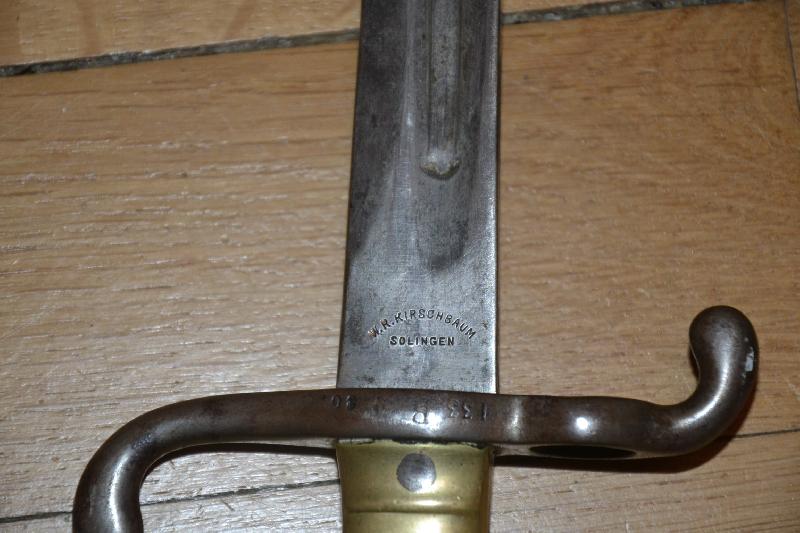Baïonnette allemande mdl 1871 avec Monogramme royal couronne et W (Wilhelm), de l’empereur Guillaume 1er de Prusse, qui régna de 1861 à 1888, année de fabrication 1875, et poinçon de contrôle .