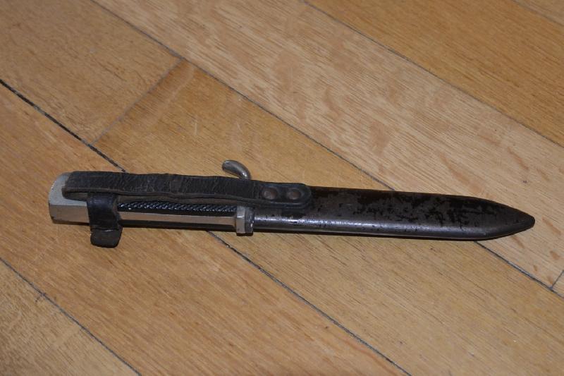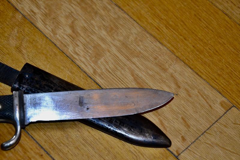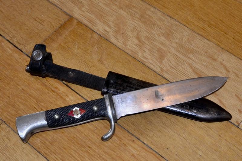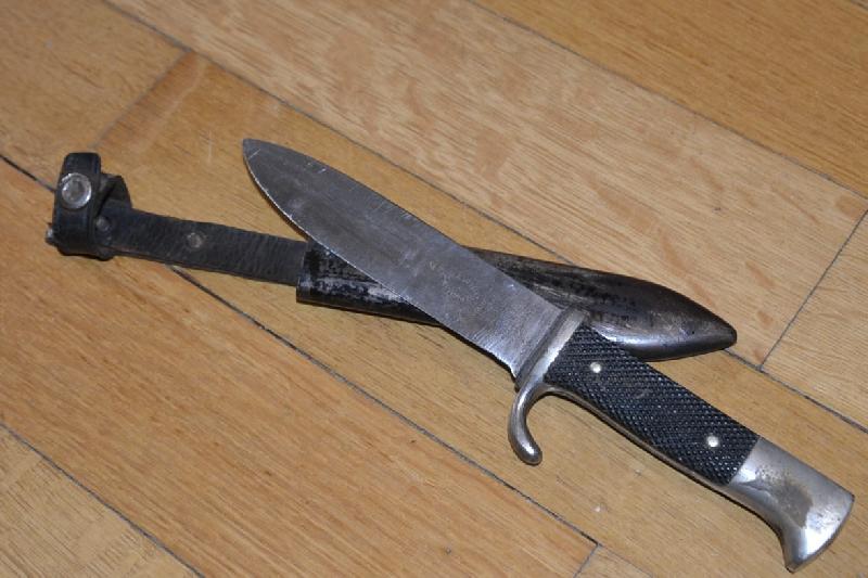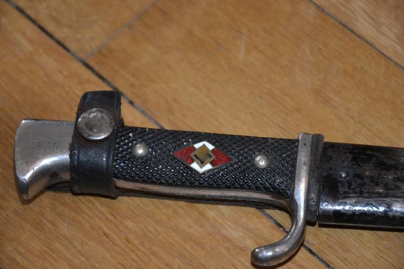 Couteau HJ 1er mdl avec lame qui démarre avec un petit décrochement , la lame porte la devise gravée « Blut und Ehre ! ». Le fabricant est marqué « Gräwiso Solingen ». Ce fabricant est très difficile à trouver. Plaquettes en bakélite noire avec marquage HJ…