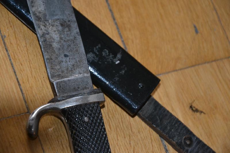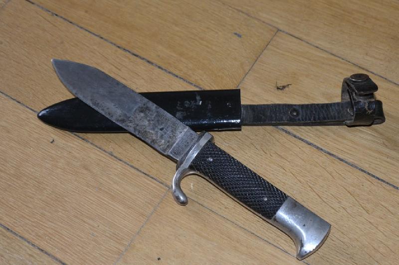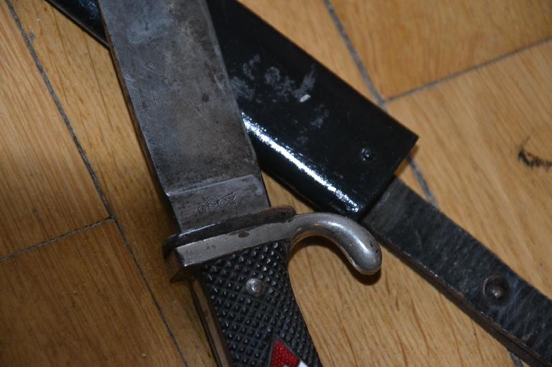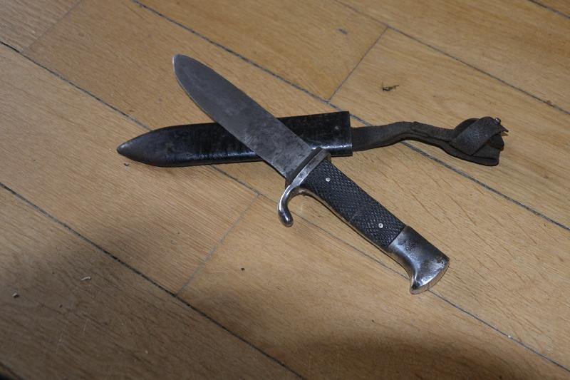 Couteau HJ avec la devise BLUT UND EHRE un peu effacé et lame aiguisée de l'autre coté le fabricant ANTON WIGEN J.B SOLINGEN GESH.GESCHUTZT
