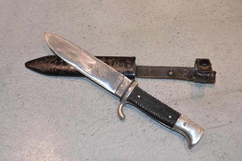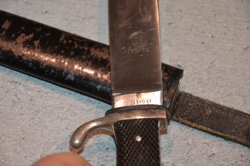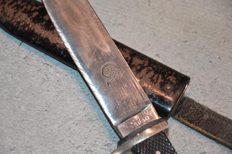 Superbe couteau de la HJ modèle de transition fabricant M7/72 ( Karl Rob. Kaldenbach ) avec la date 1940 dit modèle de transition avec petite cravate en cuir de porc à la base de la lame.