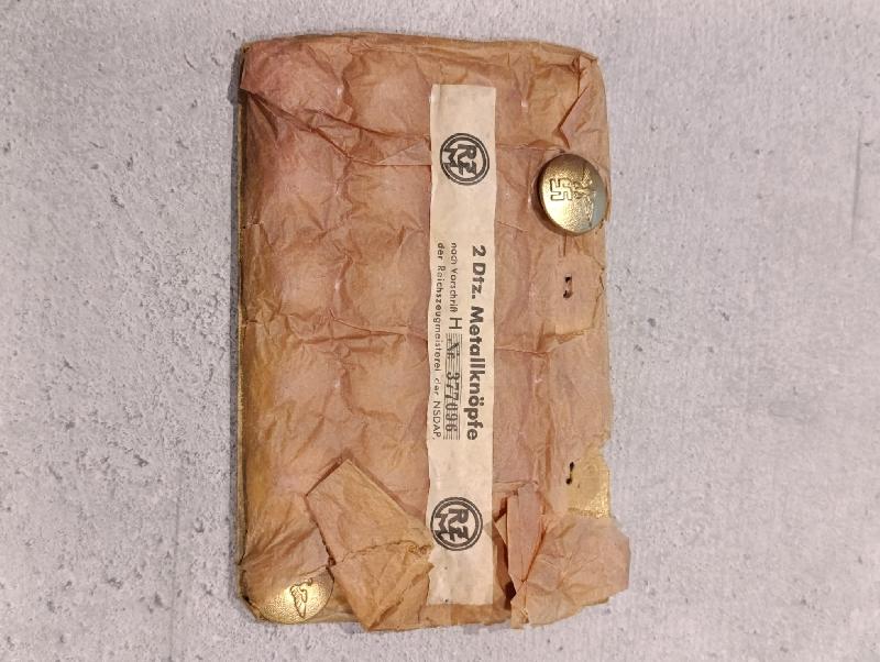 Plaquette avec 14 boutons PL doré pour uniforme avec son papier d'origine et étiquette RZM qui sort d'un stock Alsacien.