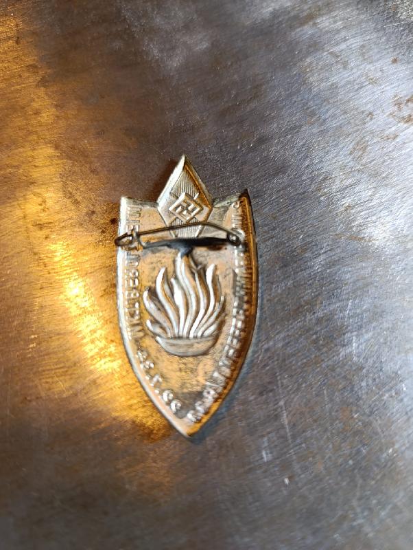 Insigne HJ en tole emboutie daté 22.7.34 MKT.BEROLZHEIM 2. UNTERBANNTREFFEN I/B33