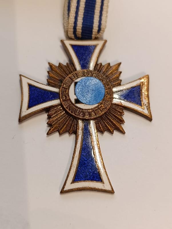 Insigne croix des mères avec son ruban émaillé avec un petit accident du coté droit voir photo.