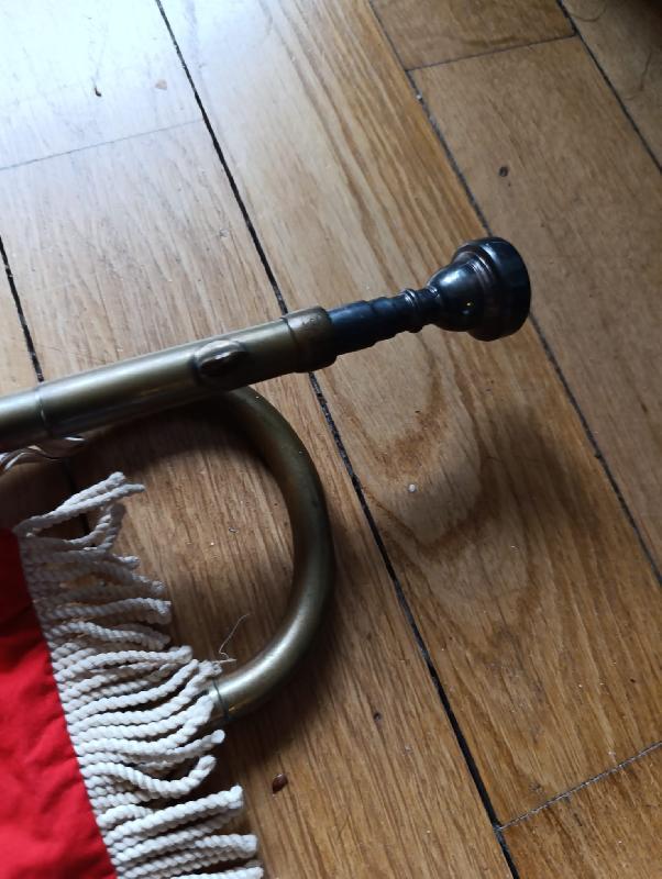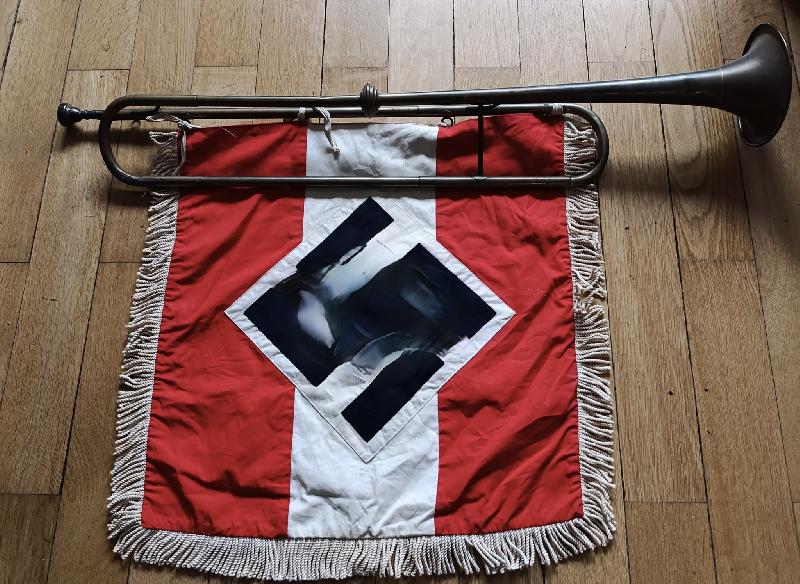 Magnifique trompette en laiton de la HJ avec sa boule et fabricant + fanion de la HJ qui provient d'un stock Alsacien de Colmar.